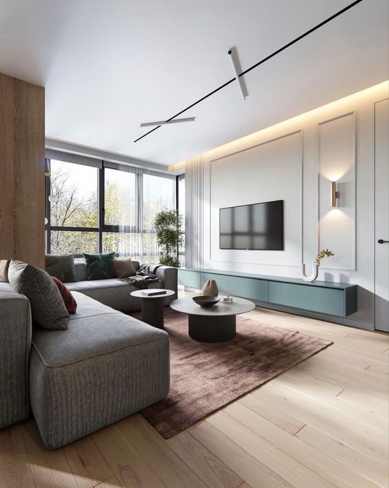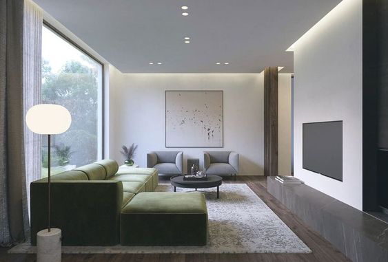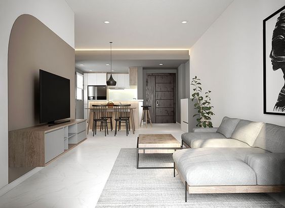 Ngoài ra các màu sắc nhẹ nhàng cũng giúp mang lại sự thông thoáng, mát mẻ cho không gian và trông căn phòng rộng rãi hơn nhiều so với thực tế. Ánh sáng cũng là một yếu tố quan trọng giúp tăng hiệu ứng thị giác và nâng cao tính thẩm mỹ cho không gian và cuộc sống, Với những gian phòng khách nhỏ như căn hộ, chung cư thì nguồn sáng được sử dụng để tạo điểm nhấn, thiết kế tối giản giúp tôn lên vẻ đẹp của những món đồ nội thất trong phòng.